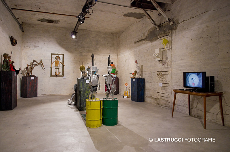 Vi sono maschere, 'ready made', assemblaggi, 'sculture', figure teatrali; sono di legno, di metallo, di plastica.