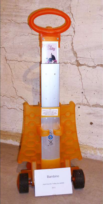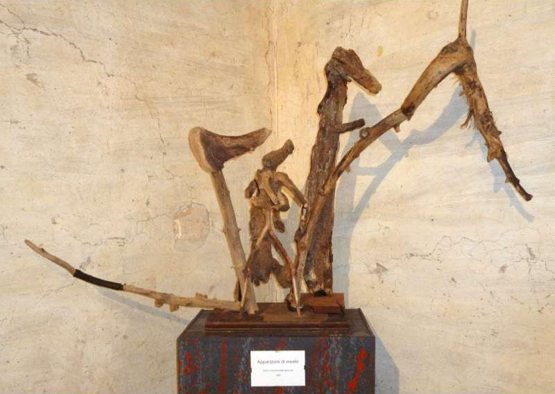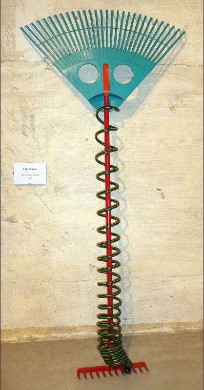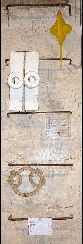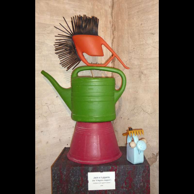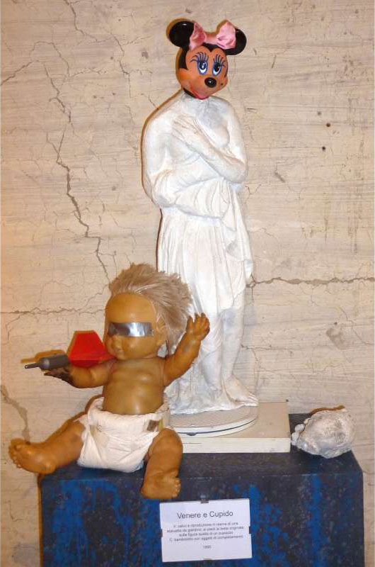 V: calco e riproduzione in resina di una statuetta da giardino; ai piedi la testa originale; sulla figura quella di un pupazzo - C: bambolotto con oggetti di completamento - 1992