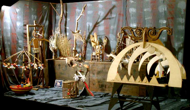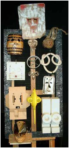 (da sinistra, in senso orario) Il paese dei balocchi - ombrello decorato con luci natalizie e trenino giocattolo Ritratto di Pinocchio [trasformabile in somaro (v. foto)] - oggetti diversi di uso comune Il bosco degli spaventi - assemblaggio di vegetali secchi All’osteria del Gambero Rosso con la Volpe e il Gatto - sedia, scopa e battipanni sagomati, pupazzo commerciale (in primo piano) Carabiniere con Pinocchio in gattabuia - sagoma in legno decorata a collage, gabbietta per uccelli e pupazzo commerciale I mostri negli incubi di Pinocchio - mobiletto, legname recuperato in spiaggia e pupazzo commerciale Dentro il pescecane (o la balena) ritagli di legno, pupazzo commerciale rielaborato, barca di balsa con testa di burattino-giocattolo e pezzi vari assemblati [click qui per una serie di immagini particolareggiate] |